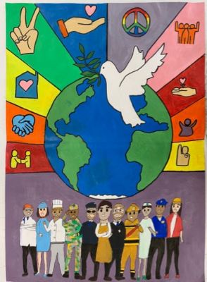 We loved the people that populated some of the posters and thought the wide range of services and jobs showed how proud we should be for our key-workers and anyone working for a greater good in times of crisis.Poppy SallowsIn my peace poster, I drew a world because not only one person needs peace, we all need peace through the world. We need to treasure people for who they are and what they want to be. I drew people that have different skin colours and genders in service uniforms. I did this because everyone needs to work together and not fight to create peace in our lives. The v sign on my poster represents peace because in WW2 Churchill made it a symbol for victory. This led to peace across Europe. |